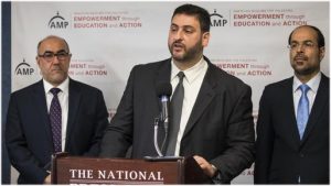 From left to right: USCMO Secretary General Oussama Jammal, Osama Abu Irshaid (National Director, AMP), and Nihad Awad (Executive Director, CAIR National)