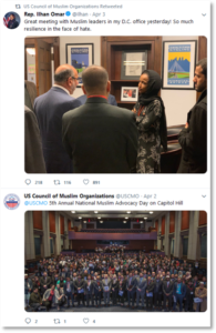 U.S. Representative Ilhan Omar has received continued support as seen on the official Twitter accounts from the senior leadership of the USCMO including Secretary General Oussama Jammal[24], Nihad Awad[25], and HAMAS dba the Council on American Islamic Relations.[26][27]