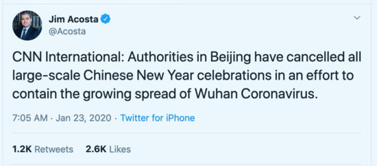 - PRC: “China has been updating the US on the coronavirus and its response since Jan. 3. On Jan. 15 the US State Department notified Americans in China US CDC’s warning about the coronavirus. And now blame China for delay? Seriously?”