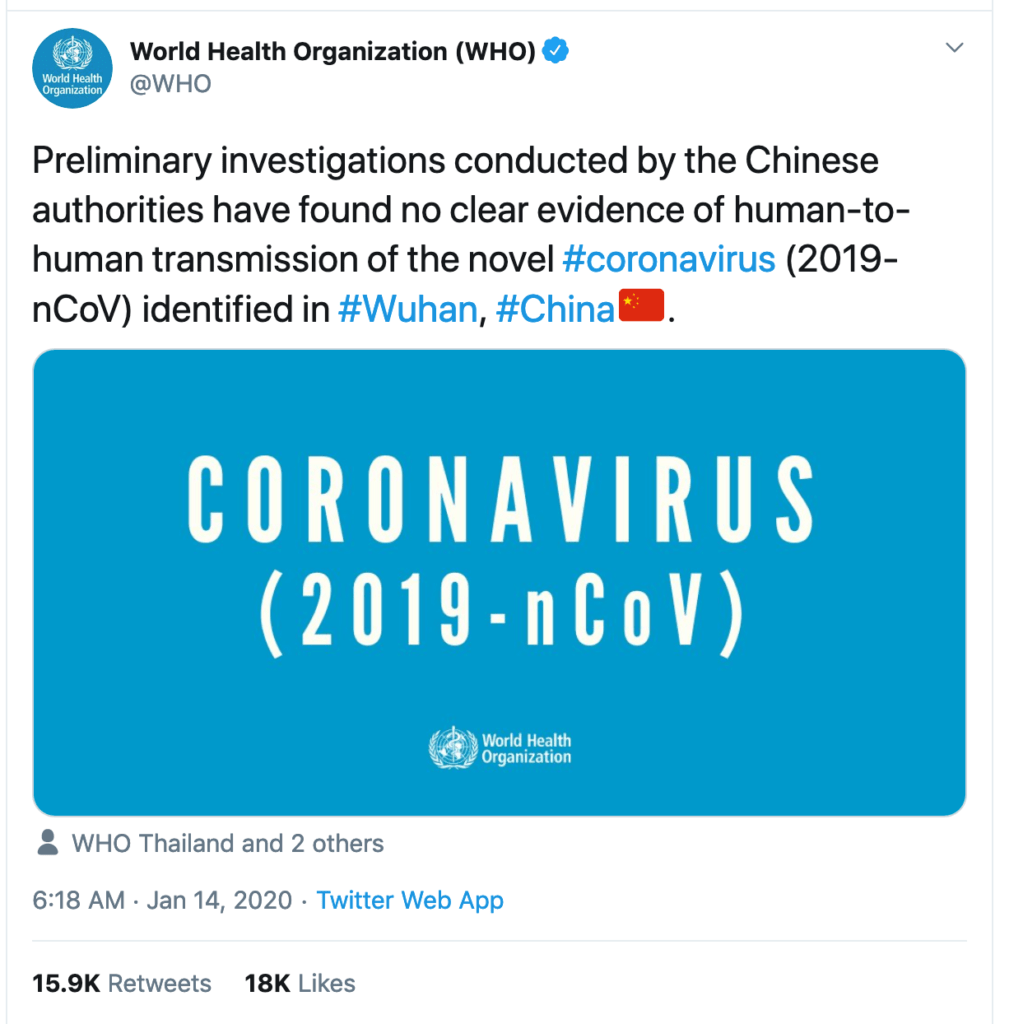 WHO repeats Chinese party line that there’s no evidence of human-to-human transmission. World Health Organization sends out message – without questioning the credibility of the source, that “Preliminary investigations conducted by the Chinese authorities have found no evidence of human-to-human transmission of the novel #coronavirus (2019-nCoV) identified in #Wuhan, #China.”