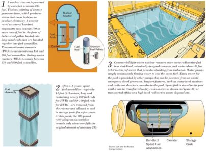 Commercial reactors in America use tiny 1-cc pellets of ceramic uranium stacked in tubes made of a zirconium alloy. These fuel rods are then secured side-by-side in a grid pattern, housed in a stainless-steel assembly. A reactor core contains hundreds of such 15-foot-tall assemblies. After four to six years in the core, enough fuel is consumed that the rods cannot sustain a chain reaction in our conventional reactors, even though a large amount of untapped nuclear energy remains. The assemblies are removed and left to cool in spent fuel pools for about 10 years before being placed in containers called “dry casks.”