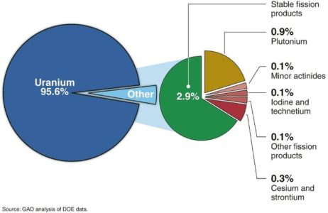 SNF contains three major radioactive components. About 95% is harmless uranium, similar to that found in nature. One percent is a synthetic byproduct, plutonium, with an average half-life of about 10,000 years, meaning it takes that long for half of the plutonium to undergo radioactive decay.