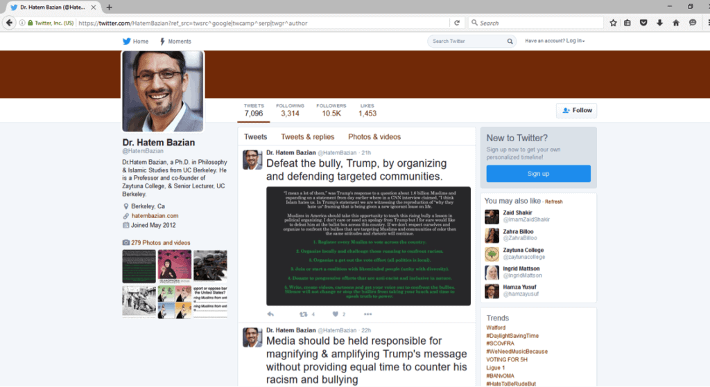 Dr. Hatem Bazian, Chairman of American Muslims for Palestine (another USCMO founding member), issued a statement via Twitter on 12 March 2016 about the previous night’s protests in Chicago. Crucial to note, Bazian was elected as a chairman of the National People of Color Student Coalition and an executive board member of the United States Student Association in the late 1980s. Not only was he an outspoken advocate for affirmative action as a student then, but he also supported the Central American Solidarity Movement, which advanced communism.